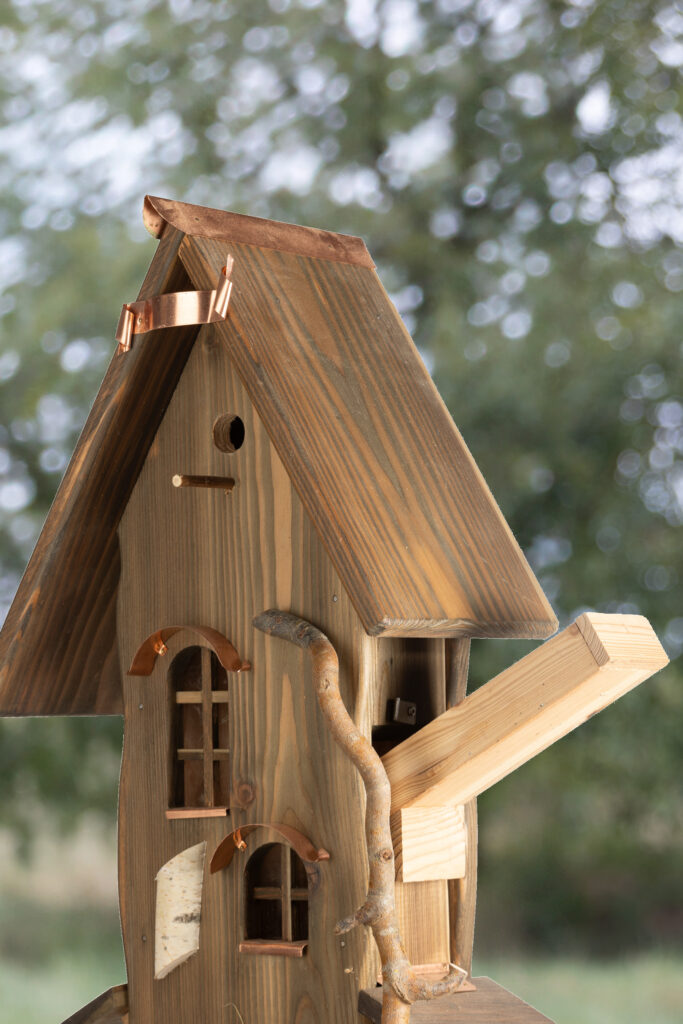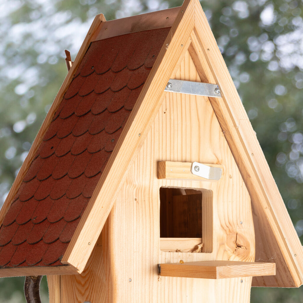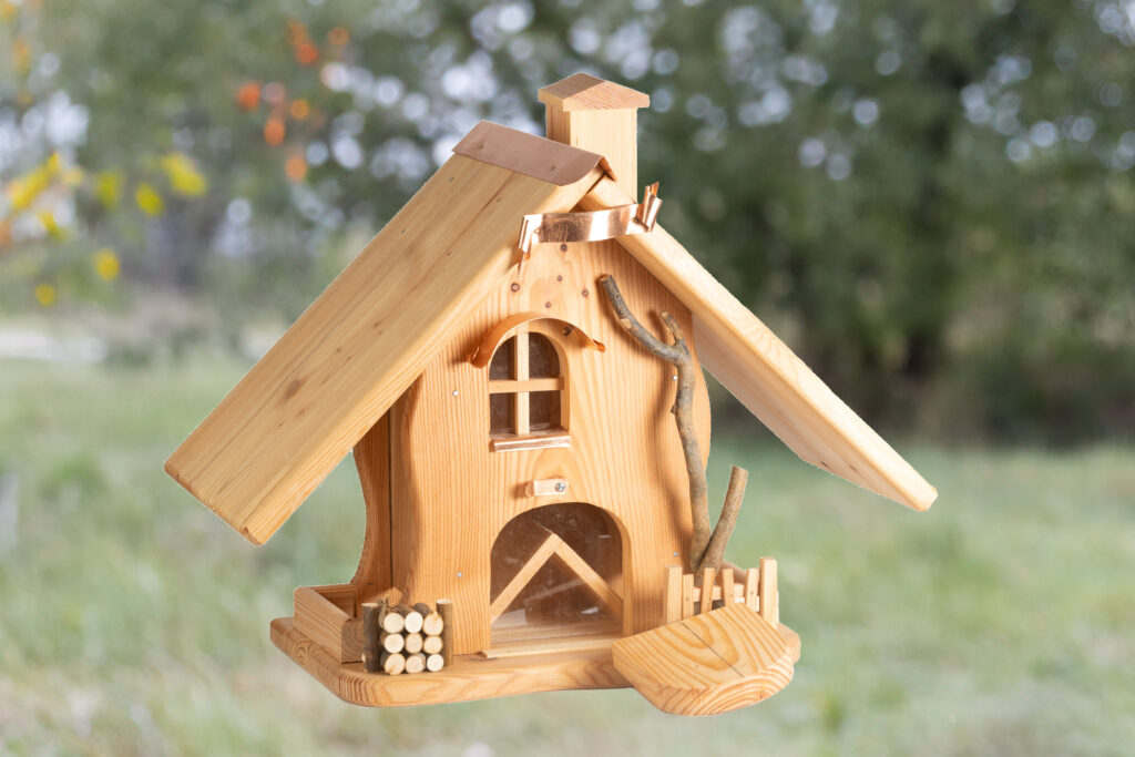 Alle Vogelhäuschen sind aus Lärchenholz gefertigt, mit Silofütterung ausgestattet und wetterfest in den Farbtönen “Natur”, “Nuss dunkel” oder “vergraut” (Altholzcharakter) lasiert.